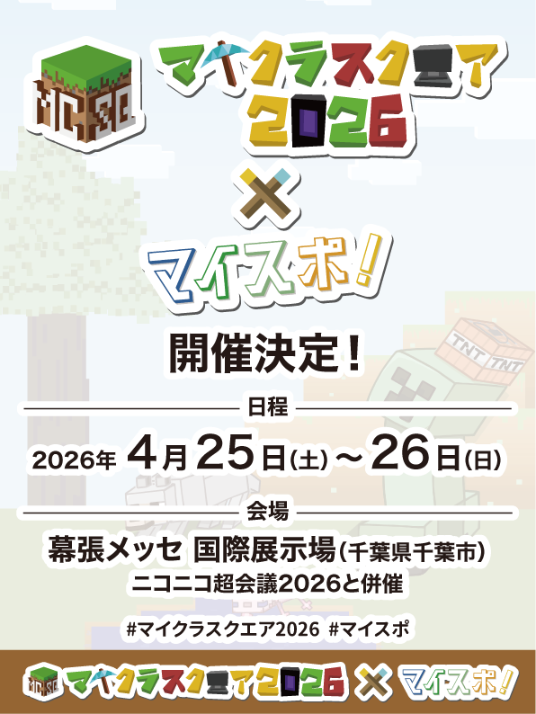 マイクラスクエア2026×マイスポ! 2026.02.16 ニコニコ超会議2025内で開催されるMinecraftのユーザーイベント「マイクラスクエア2026×マイスポ!」の公式サイトです。 企画一覧 Minecraftに関連した同人誌の頒布、製作品の展示など、Minecraftに関連した創作物を出展できる企画です。 おしらせ 2026年2月19日HPを公開しました。クラフターひろば 募集を開始しました。2026年2月1日「マイクラスクエア2026×マイスポ!」開催決定!